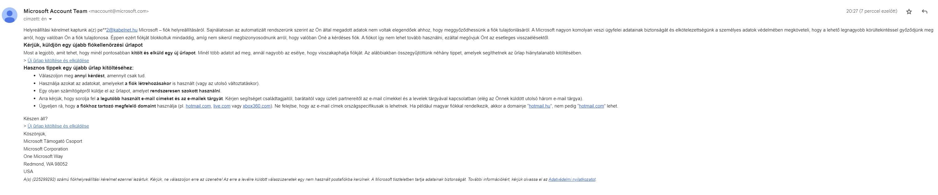 A microsoft fiókom mail címe már nem létezik. A net szolgáltatóm megszűntette a mail szolgáltatást. Én létre hoztam egy gmail-es fiókot, de Windows folyamatosan arra panaszkodik, hogy lépjek be a korábbi fiókomba, megpróbálok és kódot akar küldeni a korábbi mail címemre. Akkor kitöltöm az a lapot amivel bepróbálnak azonosítani, de mindig azt kapom válaszba, hogy nem sikerült a beazonosítás, próbáljam újra.