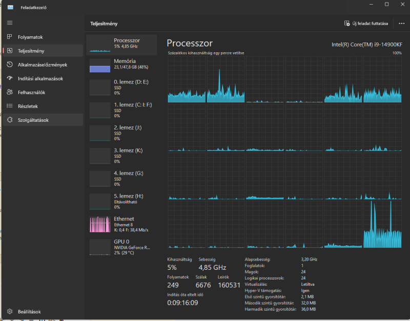 Ezalatt a Windows alatt már volt egy 3950X, egy 12900k, 13900k, 13900KS és most a 14900KF, valamint 4 alaplap.