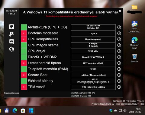 A WhyNotWin11 mindent zölden jelzett, kivéve magát a procit. -