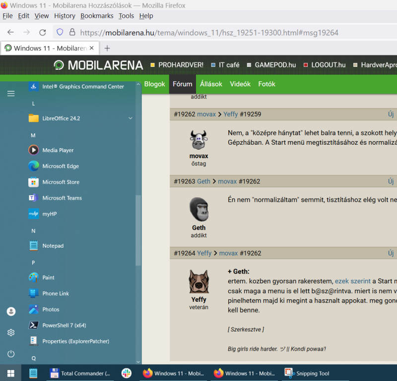 Amely utóbbi ráadásul azért is volt felesleges, mert a leírtak gyakorlatilag tény és azt nyilván nem tudod cáfolni, hogy egy céges, helyi IT által felügyelt Windows 11-es laptopon nem feltétlen telepít ugyanúgy tetszőlegesen programokat a felhasználó, módosítja kedvére a rendszerbeállításokat, mint a saját otthoni PC-jén futó Windowsnál. Azt pedig a #19266 számú hozzászólásban pont te magad írtad le, hogy „de minden egyes 3rd party alkalmazast engedelyeztetnunk kell, mint ahogy altalaban szokas cegeknel. kizart, h egy ilyen kinezet-, es funckionalitas javitot atverjek rajtuk”, vagyis akkor nagyon is jogos és reális volt az a megjegyzés, hogy másik opcióként szokni kellene a beépített Start menü és tálca használatát, ha már 3rd party programot nem feltétlen lehet a céges laptopon telepíteni ilyen célra. Ami ugye nem lehetetlen, világszerte felhasználók millióinak sikerült már otthoni és szervezeti szinten egyaránt, ahogyan ebben a topikban is többeknek.Ameddig a témához kapcsolódó, megfelelő keretek között megfogalmazott szakmai alapú és jogos megjegyzés, addig nyilván helye van itt, amit ha nem sikerül érdemlegesen a témához kapcsolódva cáfolni, akkor felesleges nekiállni firtatni.