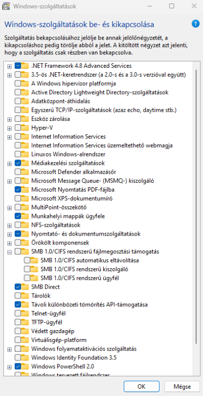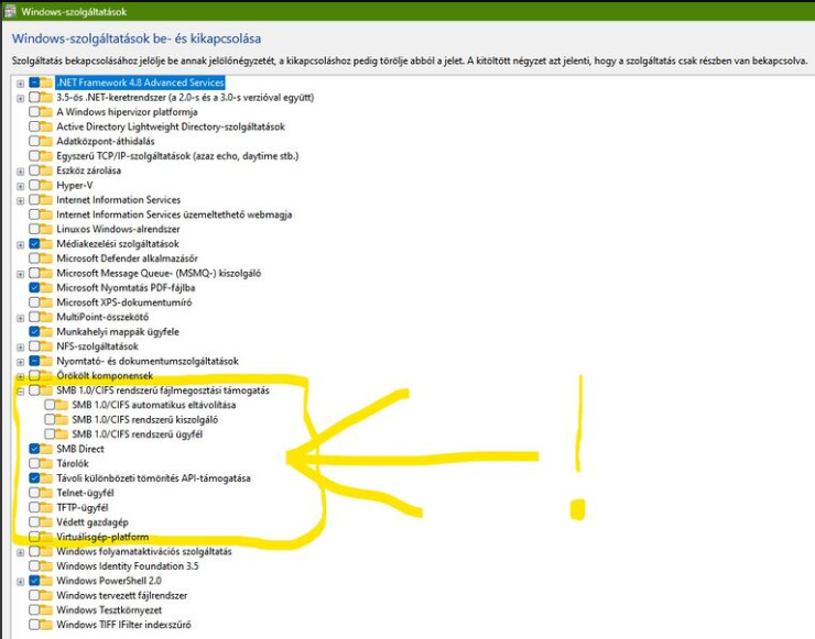 A PC-n be van kapcsolva, hogy támogassa még a régi SMB1-et is.Legközelebb nagyobb képet, alig látszik a lényeg