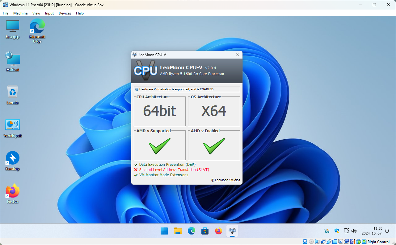 Sziasztok. Éredekes "bug" -ra ment el tegnap fél napom. Esedékes volt a windows 11 ujratelepitése a gépemen ezért gondoltam egyenesen a 24H2 -t teszem fel. Minden rendben is zajlott , már fent voltak a programok amikor a következő dolgot vettem észre: Rendszeresen használom a Noxplayer android emulátort. A régebbi windows 11-en nem volt vele gond - még tegnap reggel is futattam. Aztán az uj windows 24h2-re fel se települt. Azt panaszolta, hogy nincs bekapcsolva a BIOS-ba a virtualizáció. (pedig de). A weboldalukon böngészve találtam egy pici programot LeoMoon CPU-V a neve és megmutatja hogy minden rendben van e virtualizáció terén. Nos ez a program állitása szerint az alsó 2 opció nálam nem múködött (bekarikázott rész) - piros szinnel jelent meg. Visszaraktam a 23H2 win 11-et. Ott is lefutattam és ahogy a csatolt képen is látszik, minden rendben (és fut is a Noxplayer).