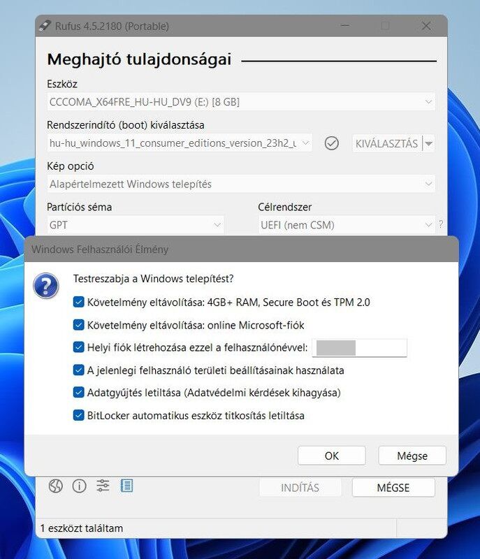 Éppen most nyomtam fel egy MS-ről letöltött Rufus által kiírt ISO telepítőt igy i3 gen 4 asztali gépre tiszta telepítéssel. (#22460) A Rufus indításkor mindent bepipáltam.