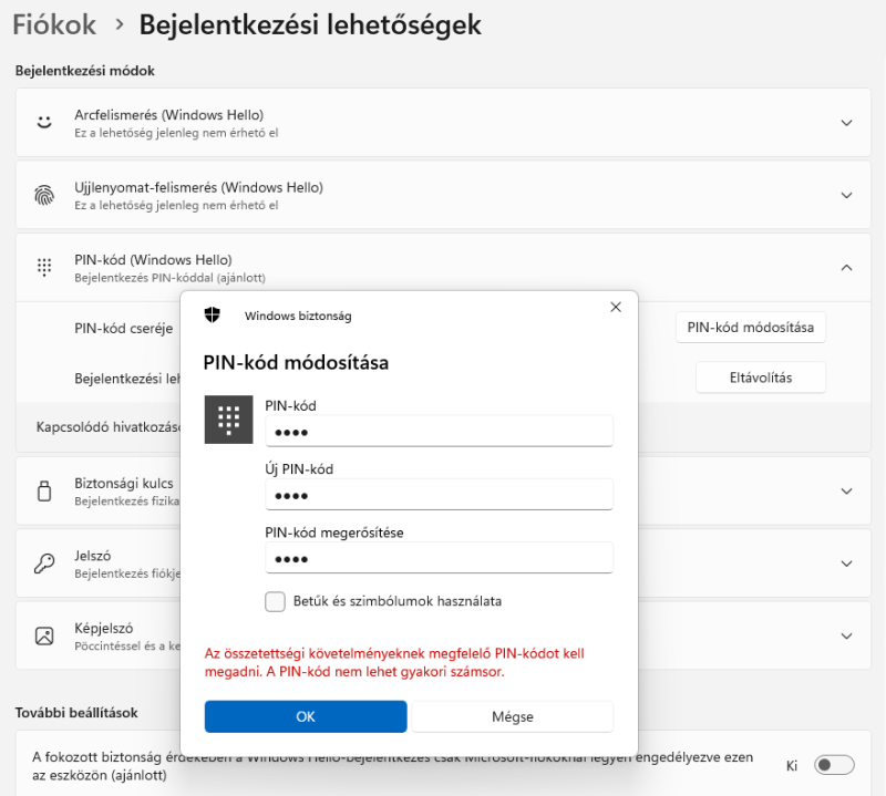 Miért nem tudom a pin kódomat "1111"-re változtatni?