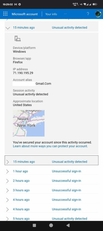 Tegnap kaptam egy értesítést hogy valaki megpróbált bejelentkezni a windows accountomba. Beléptem a tevékenységek áttekintéséhez, és kb. óránként próbálkozik amerikából (egy vagy több) bot
