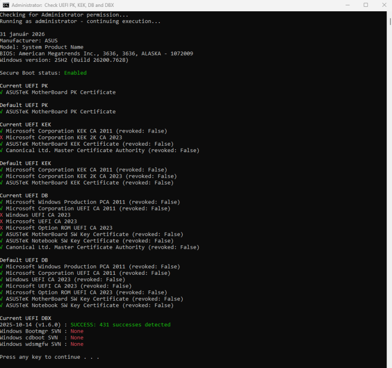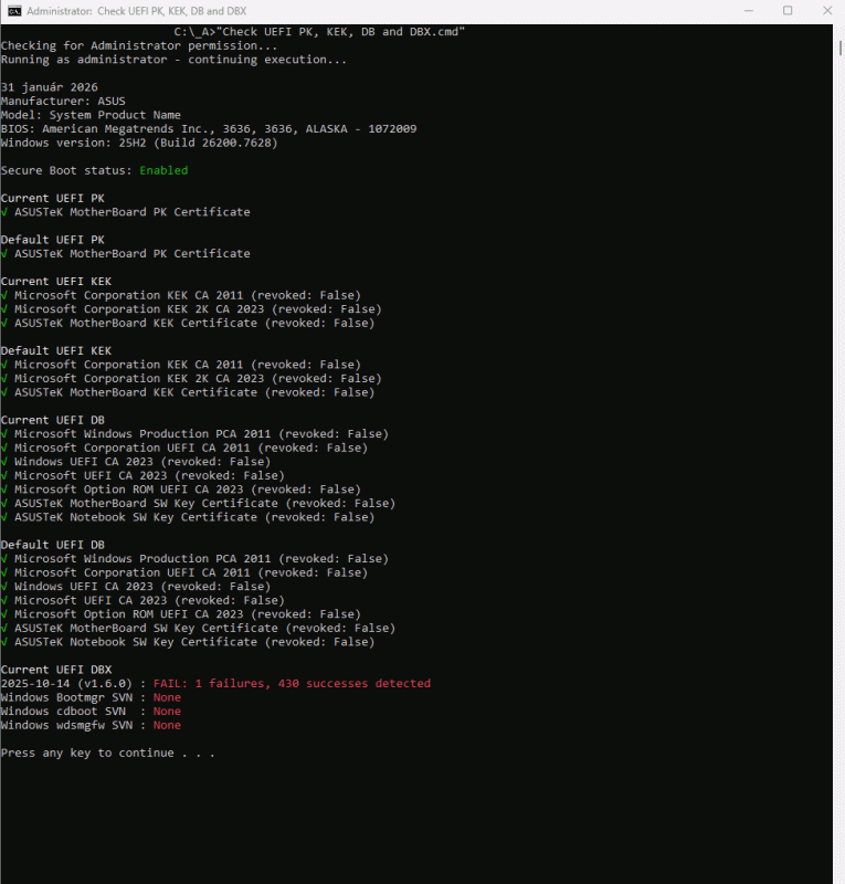 A Github-on talált Check-UEFISecureBootVariables script segítségével lekérdeztem az UEFI-ben lévő Secure Boot változókat most a BIOS frissítés után: