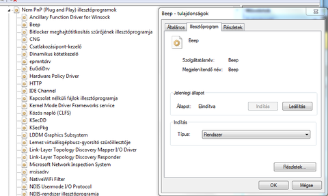 A Nem plug and play illesztőprogramoknál a Beep-re jobb klikk, a tulajdonságainál válaszd az Illesztőprogram fület.