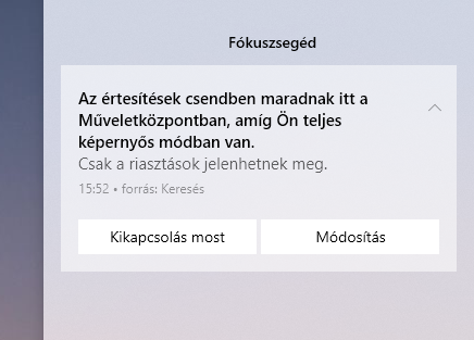 Ha annyira zavar, akkor ezen leírás alapján testre tudod szabni a gépházban a fókuszsegéd beállításait, sőt az is beállítható, hogy teljes képernyős módban használva egy alkalmazást legyen-e értesítés a műveletközpontban.