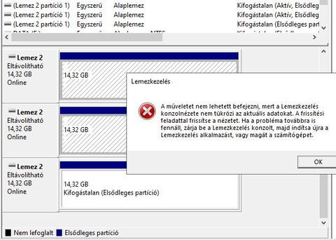 Sikerült bootolható win 10 telepítő közben kétszer is elérhetetlenné tenni a pendrive-ot. Ennek köszönhetően a pendrive-ot nem akarja felismerni a gép. Pontosabban a lemezkezelőben látom, formázni is tudom és még további kettőt is látok belőle. Amit viszont sem törölni, sem formázni nem tudok. A további kettő közül egyikkel sem tudok mit csinálni, mert bármit akarok csinálni, az alábbi hibaüzenet jön. Viszont az amire rá tudok klikkelni azt tudom formázni, meg betűjelet is tudok választani hozzá. Viszont amint "leokéznám" az ablakot jön egy olyan hibaüzenet, hogy "A kötet létrehozása sikerült, de a formázás nem történt meg. Próbálja újra formázni a kötetet a formázási feladattal."