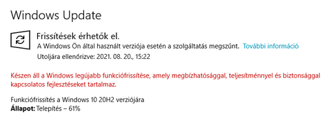 + Ha a Windows Update nem tudja telepíteni az új funkciófrissítést, akkor az upgrade-hez opció a frissítési segéd / MCT / 20H2 vagy 21H1 ISO in-place upgrade is, + előtte szükség esetén a C:\Windows\SoftwareDistribution\Download mappa tartalmának törlése.