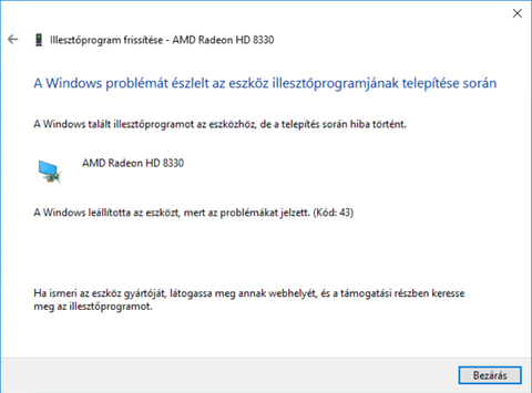 Az AMD telepítő elhasal, azt írja nem támogatott meg nem tudja telepíteni, az Eszközkezelőből kerestetve inf drivert, feltelepít mindent majd az alábbi üzenet jön: