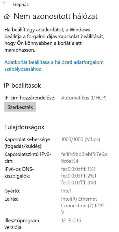 Bedugtam egy windows 8.1-es laptopba és ott is nem azonosított hálózatként van jelen az ethernet csatlakozás.