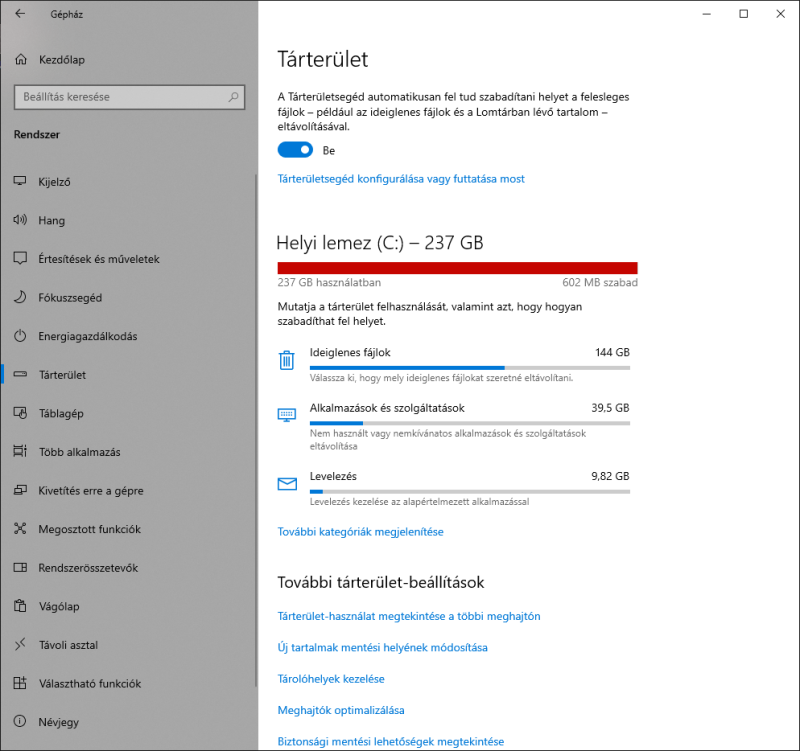Kicsit böngésztem a neten és rájöttem, hogy a gépház/rendszer/tárterület menüben is van egy lekérdezési lehetőség és itt is tökéletesen azt mutatja, hogy az "ideiglenes fájlok" az eszméletlen nagyok. Egyszerű megoldás lenne ezeket törölni, de bizony nem törli: