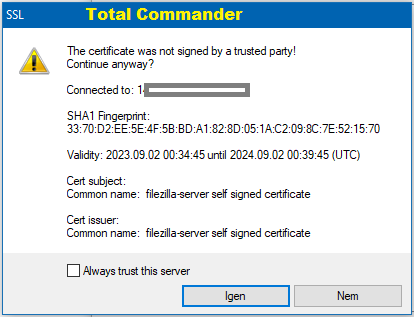 FTPs esetén is figyelmeztet hogy megváltozott a kulcs SHA összege ilyen esetben