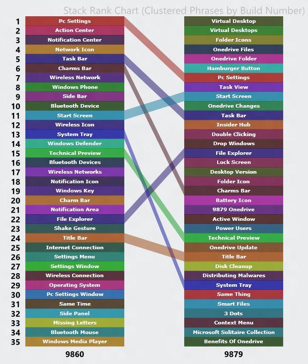 "Here's a pic from one of our #WindowsInsiders feedback analysis tools, showing trending topics between 9860 and 9879." [link]