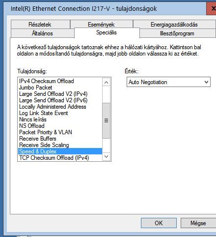 Tehát, Hálózati és megosztási központ megnyitása, ott katt az Ethernet-re/Tulajdonságok/Beállítások/Speciális/ itt a Tulajdonságok közül kiválasztani a Speed és Duplex-et, és jobbra az Auto Negotiation-t átállítani 100 Mbps értékre.