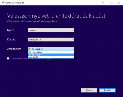 (Ha az Architektúránál a MINDKETTŐ lehetőséget választod(így lehet kiválasztani), akkor a 32 és 64 bites Home és Pro változat közül választhatsz. Ekkor egy ~5,5GB méretű ISO jön létre) -
