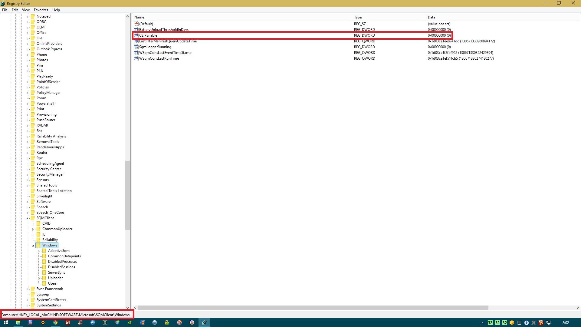 Disable Customer Experience Improvement Program (CEIP): [link] Start\Futtatás\regedit. Majd ellépkedünk a képen pirossal jelölt helyre és a CEIPEnable névnél a "Data" mezőben található értéket kell átírni az 1-ről 0-ra.