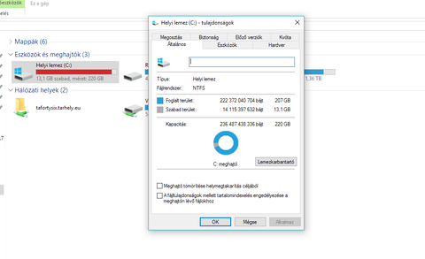 Ezzel szemben az alábbi képen az látható, hogy a C meghajtón 207GB foglalt, és 13GB van szabadon (most épp, törölgettem ezt/azt, hogy ne legyen csontra 0MB).