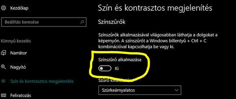 Irány a Műveletközpont - (Gépház-Minden beállítás) Könnyű kezelés azon belül pedig szín és kontrasztos megjelenítés - Ott be volt kapcsolva a színszűrő alkalmazás - Kikapcsoltam - megjavult! De ki kapcsolta be?