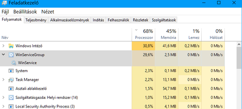Mi az a WinServiceGroup, eddig nem volt, ez 30%-on eszi a procit, és ilyenkor a Windows Intéző is 30% körül van, ez a 60% tökéletesen használhatatlanná teszi a szerencsétlen Z8300 Atom procit.
