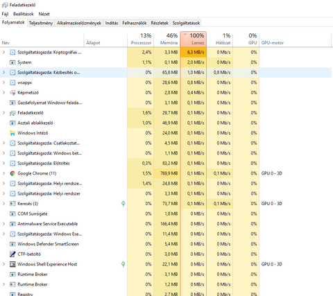 A lemezkihasználtság 100%-os, pedig alig van adatáramlás (lásd a csatolt képet). Egy TOSHIBA MQ01ABD100 1TB-os HDD van a laptopban, ami egy DELL INSPIRON 5759-es. 8GB RAM, i5-6200U-s proci.