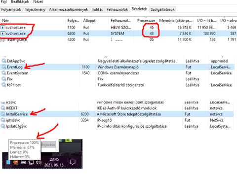 Próbáltam érthetően lefotózni. 🙂 2 svchost.exe futott folyamatosan, amik az (ugrás a szolgáltatásokra után mutatja, hogy) Installsevice.exe és az Eventlog.exe szolgáltatásokat futtatták, azaz terhelték 100%-ra a CPU-t. 😠 -