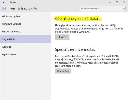 A gépházba létezik egy olyan menü hogy frissítés és biztonság. Ott a helyreállítás-t választva A Gép alaphelyzetbe állítása opciót kiválasztva van lehetőség a rendszer telepítésszerű alapállapotának elérésére.