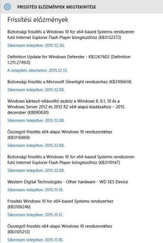 Így 4 nap elteltével kérdezném, van még valaki, akinek a normál frissítési rendszer még dobta fel a TH2-öt? Most indítottam a gépet, és még azt írja ki, hogy nem találhatók frissítések. Az utolsó frissítés nov. 12-én jött le, ez a KB3106246-os volt. Tudom, hogy lehetne gyorsítani, de nekem nem sürgős, mert a mostani állapotában szerencsére minden normálisan működik, csak kíváncsi vagyok, hogy én vagyok-e az utolsó mohikán.