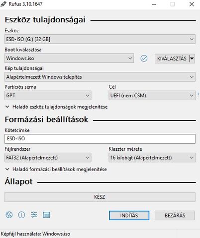Magát a windowst rufussal írtam ki pendrivera, méghozzá az alábbi beállításokkal: