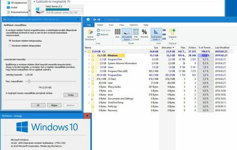 Ahogy látszik is, a op. rendszer mellett van nagyjából 20 program telepítve( 3,2 GB ), ezekből a legnagyobb méretű, a Libre Office. A rendszer-visszaállításra be van állítva kb. 2 GB, virtuális memóriára is kb. 800 MB, és még így is van több mint 10 GB-nyi szabad helyem.