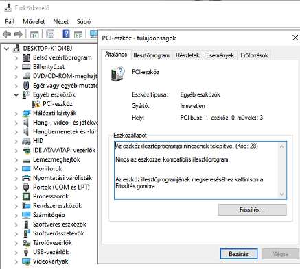 Az eszközkezelőben észrevettem, egy sárga felkiáltójeles PCI eszközt, amire azt írja a rendszer, hogy nem talál hozzá drivert.