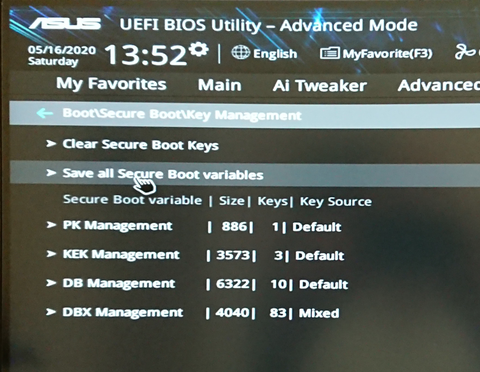 Gondolom, hogy ez így akkor rendben van, viszont van egy másik funkció, az a Key Management, és azon belül is, ez a bizonyos Save all Secure Boot Variables. Van itt PK, KEK, DB, DBX variáció, szóval mik ezek, és kell nekem ezzel egyáltalán foglalkozni, vagy hagyjam a francba úgy ahogy van?