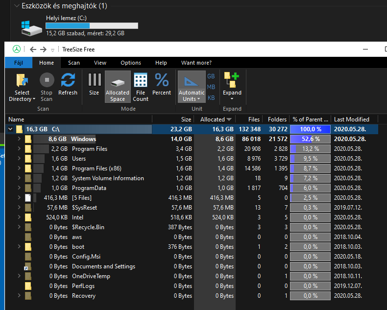 Mivel minden normálisan működött, ezért a gépházas Tárterületsegéddel töröltem az Old mappát, és így jelenleg 15 GB szabad helyem maradt még.