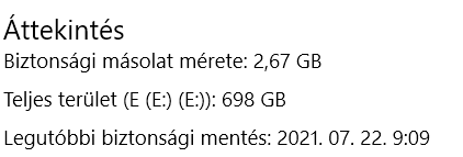 Nem vagyok tisztában a biztonsági másolatok készítéssel. Win 10 Pro van nálam egy asztali gépen. A Gépházban be van állítva automatikus óránkénti a biztonsági mentés és fel van sorolva pár mappa, amit gondolom anno kijelöltem. A Bizt. mentés áttekintés elején ezt látom: