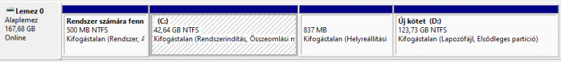 Viszont bő 5 éve nem kalkuláltam bele, hogy 45 GB kevés lesz a win10-nek, és így néznek ki a lemezkezelőben az ssd partíciói: