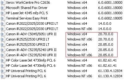 Igen, ugyanaz a driver került fel a kliensre. A tegnapi hiba egyébként olyan gépen jött elő, melyen csak a printsrv-s nyomtatók voltak telepítve, tehát más korábbi kavar nem fordulhatott elő..Közben sikerült leredukálni a dolgot 1 bizonyos nyomtatóra. Ezt a szerver 32 és 64 bit driverből külön típussal hajtotta (20.70 és 20.85). A hiba egyébként azelőtt is jelentkezett, mikor mind2 architektúra azonos (20.70) driverrel ment.