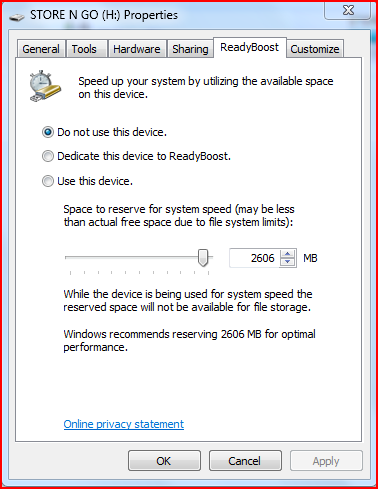 Kikeresed a ReadyBoost fület, és ott a Use this device opcióra mész. A csuszkával tudod állítani mennyi területet használjon a pendrive-ról, majd Apply. És kész is.