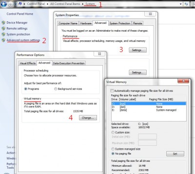 system - advanced system settings - performance settings - advanced fül - virtual memory