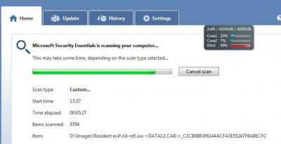 Microsoft Security essentials-t használók közül találkozott már valaki olyannal, hogy Full scan-nél lefoglalja magának az összes rendelkezésre álló ram mennyiséget?