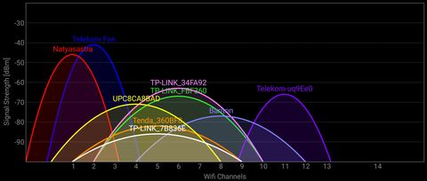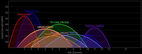 Feltételezem attól válik terheltté a "levegő", ha sok hálózat üzemel egy időben, azaz sok WiFi jel kering a térben. Namármost ez egy olyan vidéki kertes ház, hogy kb. csak a saját hálózatunkat lehet befogni. Egyszer egyszer megjelenik az inssiderben valamelyik szomszéd netje, vagy az upc wifree, de mind az 1-es csatornán vannak és ezek azonnal el is tűnnek, olyan gyenge a jelük.