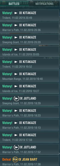 FoxiestFox: Én ma felmásztam rank 7 nulla csillagig, mondom este folytatom munka után. Jött egy 3-as winstreak, persze mikor egy csillag kellett volna a 6-hoz kikaptunk. Én egyedül JB-vel lefoglaltam 2 enemy DD-t(nem tudtak kitorpozni, talán egyet kaptam, amikor a crosstorpozással nem tudtam mit kezdeni), a map másik oldalán persze a komplett csapatomat kiírtotta a 3. enemy Black. És persze nem nekem maradt meg a csillagom, hanem a musashinknak, aki 30-al több xp-t kapott, csak mert le tudta lőni az enemy Buffaloját 3k hp-ról. Azt az egy hajót vesztették amúgy. Nem pattant el amúgy egy db ér sem az agyamban...