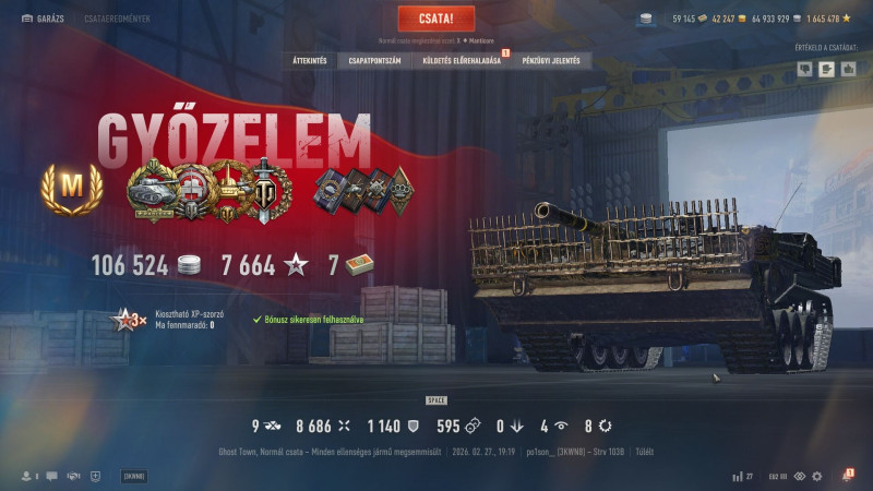 Eddig a T8 van meg, talán 10k xp kellene a kilenceshez, de én még gold lőszert nem vittem be vele csatába..Azaz még soha nem lőttem vele goldot..Nem emlékszem, hogy mínuszban lettem volna ele egyszer is..