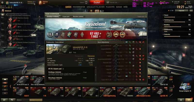 Közben a kabaré tovább folytatódik, már csak röhögök kínomban. Látod fradi, sikerült egy újabb százassal lejjebb tornásznom az átlagot, most már elmondhatom, hogy ugyanannyi meccs alapján egy százassal többet lövök a Cromwellel, mint a Pershinggel. Nagy dicsőség! Miközben azért tegnap is gurultam értelmes karikákat minden más tankkal... Lehet hogy free xp lesz ebből.