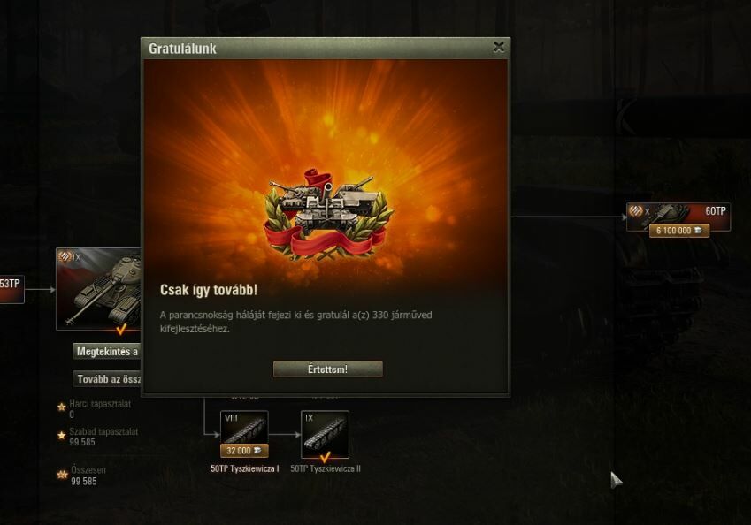 50TP-t ajánlom mindenkinek aki szereti a jó heavyket. Nagyon jó löveggel rendelkezik, baromi nagyot sebez, van páncél, tud pattintani és ehhez még mobilis is. 66 csata kellett a 60TP-hez és kevés olyan csatám volt, amit nem élveztem volna vele.