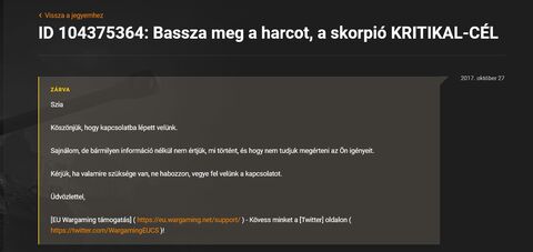 I am pleased to inform you that we understand your problem and want to help you solve it. Fortunately we have knowledge of the problem that the players are having and we are working to solve it as quickly as we can. If you have any other questions, don’t hesitate to contact us. Wish you good luck in your battles and have a nice day. Kind regards"A másik válasz (1 órája):