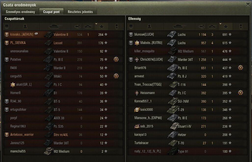 Tudom, nem vigasztal, de az AT 15A-val 27%-ról küzdöm magam felfelé. Tanks gg szerint szemből nem látok rajta gyenge pontot, mégis belőnek /nem felülről/ 4-ből 4x KV2-vel messziről, és eggyel alacsonyabb kategóriás medekkel is. Amikor nyer a csapat, a célpontok felkínálják magukat szinte, keresztbe fordított toronnyal, fedezékből teljesen kibújva, és nem reagálva az eseményekre körülöttük. Akkor inkább lenne vesztes csata, de tisztességes harcban.