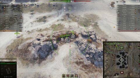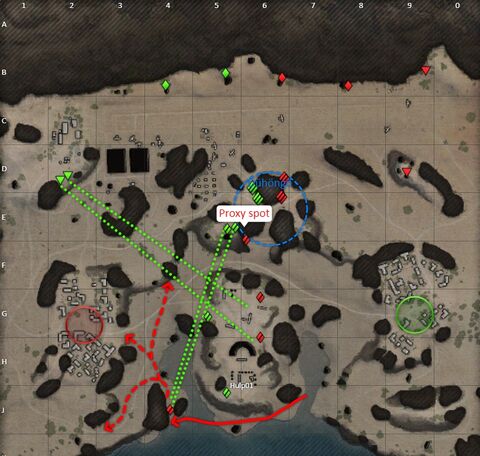 A piros szaggatott a továbbhaladási lehetőség, amit csak akkor használhat ki, ha E5 üres. Ha tornyozni próbál, akkor spot kellene, különben egy szép céltábla a tankja, semmi egyéb.Engem az északi rész zavar, mert a lightok bokrai/sziklái csőpályává degradálják az egészet. Ha arty nem hülye, akkor belövi a heavyket, a TáDék mindkét oldalt fogják, az bukik, aki előbb veszíti el a türelmét. Pedig nem lenne rossz pálya.