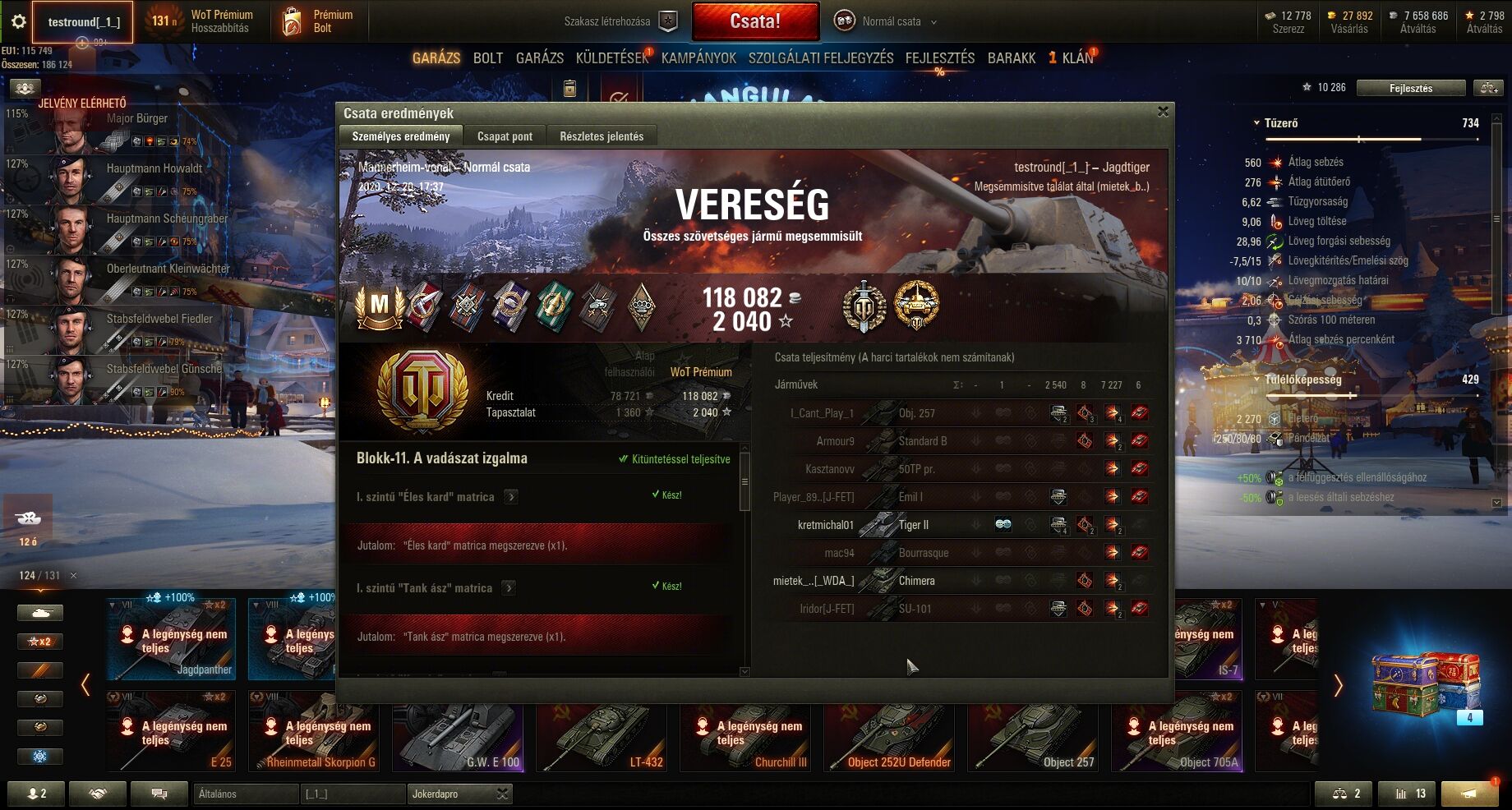 Téma volt ma is az ág, én most léptem a jagdtigerre. Ferdit a nagy ágyúval a végén megszerettem, erre meg 5 csata után rátoltam 34k xpt, hogy meglegyen a nagy ágyú...A mai cspatok kikészítettek és nem bírtam tovább. Két körrel rá ez jött össze. Kár, hogy elvesztettem. A végén 1v3ban maradtam a tiger/chimera/conway trioval. Tiger fullhpn ért oda hozzám mire megjött a chimera már tiger is 1hit lett volna, aztán zsinorban 3 miss után ki tudak szedni.