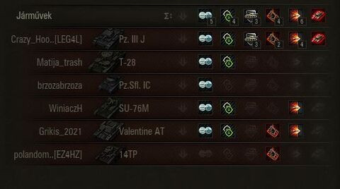 ..Ma ismét elég sok a segg, úgy látom a csatákban. A harmadik 2:15-3:15-szintű vereséget nyomjuk úgy, hogy low tierként egy szaros O274a-val a top senző tudok lenni hét heavy és egy rakás TD mellett is. Ok, tudom, a vesztés egy dolog, de pl. ha ilyen csatákat megnyernénk, akkor nem lófasz eredménye lenne. Legalább négy olyan csatám volt az utóbbi tízből, ahol elindultak a lemmingek, szartak a másik oldalra, totál nulla szinten. Merthogy majd pusss. Aham. Aztán mégsem, közben meg a másik oldalról bejöttek négyen foglalni és ennyi volt. A 3 perces csaták faja kis receptje.